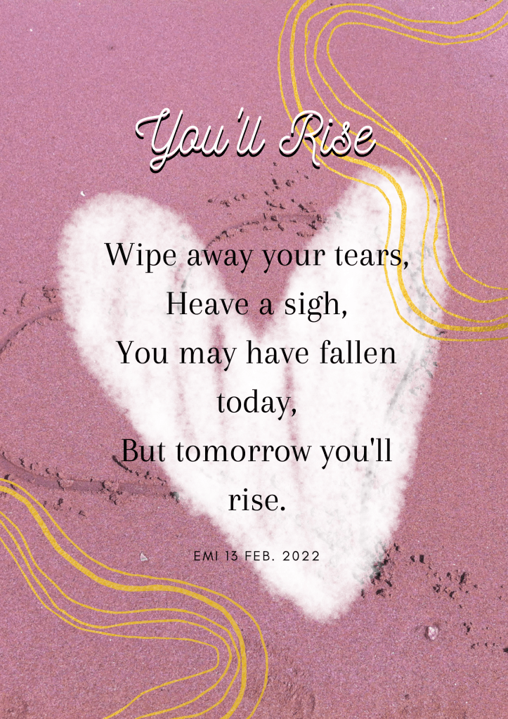 Life and Inspiration You’ll Rise Posted by Emi_F on February 13, 2022 Share this: Click to share on X (Opens in new window) X Click to share on Facebook (Opens in new window) Facebook Like Loading... Related