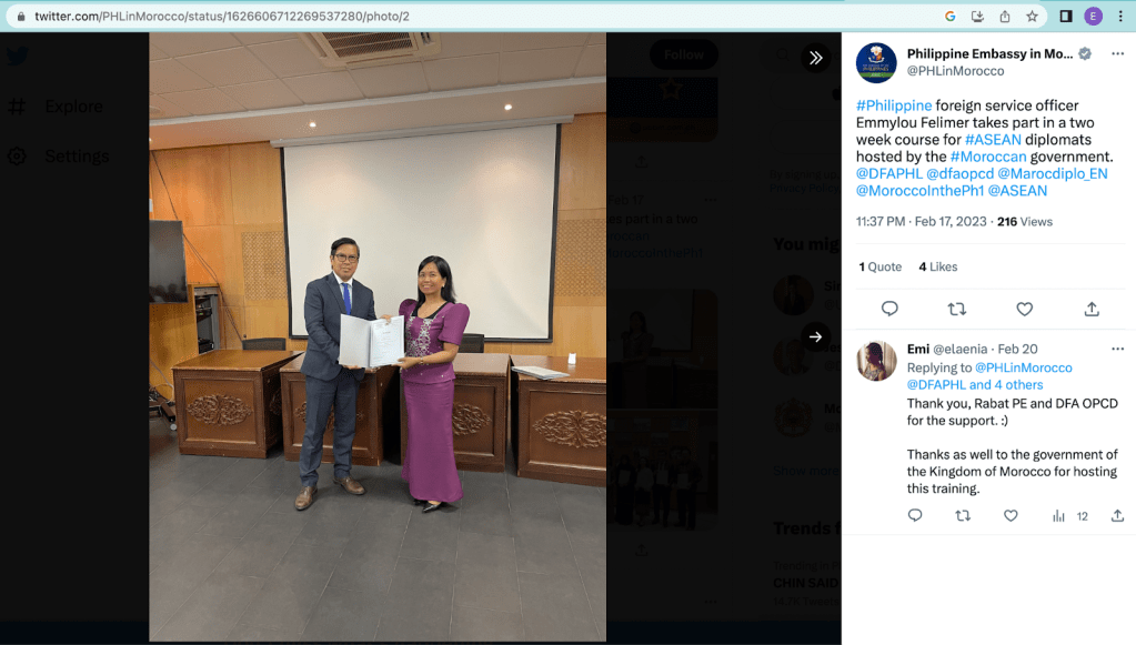 In February 2023, I had the wonderful opportunity to stay in Morocco for two (2) weeks for the International Diplomatic Training for Senior Diplomats from ASEAN Countries. It was a scholarship program that I applied for, and thankfully, I passed the qualifications, and became the sole representative from the Department of Foreign Affairs of the Philippines to attend that program that year. Organized by the Moroccan Academy of Diplomatic Studies (AMED) and fully-funded by the Moroccan Agency for International Cooperation.